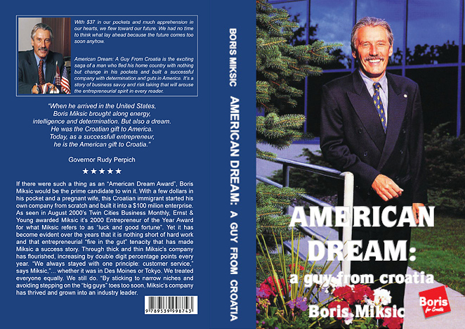 "With $37 in our pockets and much apprehension in our hearts, we flew toward our future. We had no time to think what lay ahead because the future conies to soon anyhow." American Dream: A Guy From Croatia is the exciting saga of a man who fled his home country with nothing but change in his pockets and built a successful company with determination and guts in America. It's a story of business savvy and risk taking that will arouse the entrepreneurial spirit in every reader. "When he arrived in the United States, Boris Miksic brought along energy, intelligence and determination. But also a dream. He was the Croatian gift to America. Today, as a successful entrepreneur, he is the American gift to Croatia." — Governor Rudy Perpich "I am proud that my fellow-countryman Boris Miksic, with his courage, perseverance and great diligence, achieved a real and great success in an expert and professional field. Particularly, I am pleased that he always maintained a human and patriotic relation toward..., his homeland Croatia, which he is wholeheartedly helping from its beginning struggle for independence until this day, on a humanitarian, promotional, business and governmental level. — Smiljan Simac, Ambassador of the Republic of Croatia to France If there were such a thing as an "American Dream Award", Boris Miksic would be the prime candidate to win it. With a few dollars in his pocket and a pregnant wife, this Croatian immigrant started his own company from scratch and built it into a $25 million enterprise. As seen in August 2000's Twin Cities Business Monthly, Ernst & Young awarded Miksic it's 2000 Entrepreneur of the Year Award for what Miksic refers to as "luck and good fortune". Yet it has become evident over the years that it is nothing short of hard work and that entrepreneurial "fire in the gut" tenacity that has made Miksic a success story. Through thick and thin Miksic's company has flourished, increasing by double digit percentage points every year. "We always stayed with one principle: customer service," says Miksic, "... whether it was in Des Moines or Tokyo. We treated everyone equally. We still do." By sticking to narrow niches and avoiding stepping on the "big guys'" toes too soon, Miksic's company has thrived and grown into an industry leader. |